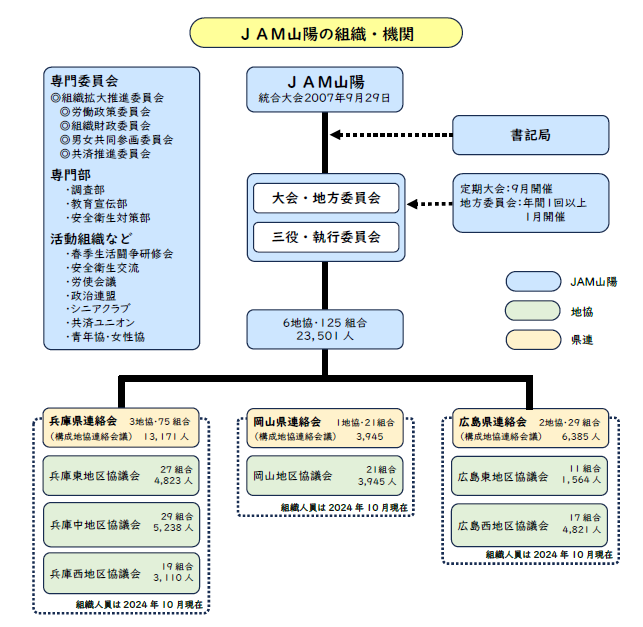 JAM山陽はものづくり産業労働組合JAMに加盟する「兵庫県・岡山県・広島県」に集まる単位労働組合(単組)を束ねる地方組織です。主に機械金属産業で働く仲間で構成され、128単組・23,958人が加盟しています。